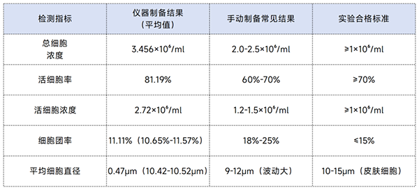 實(shí)驗(yàn)結(jié)果也印證了這一點(diǎn):儀器制備的懸液濁度僅 0.89.細(xì)胞平均直徑 10.52μm(符合皮膚細(xì)胞正常范圍),后續(xù)做流式檢測時(shí),雜質(zhì)干擾信號(hào)比手動(dòng)法低了 18%。