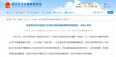 11月12日,武漢衛健委發布消息稱,發現3份巴西進口牛肉標本新冠病毒核酸檢測呈陽性。