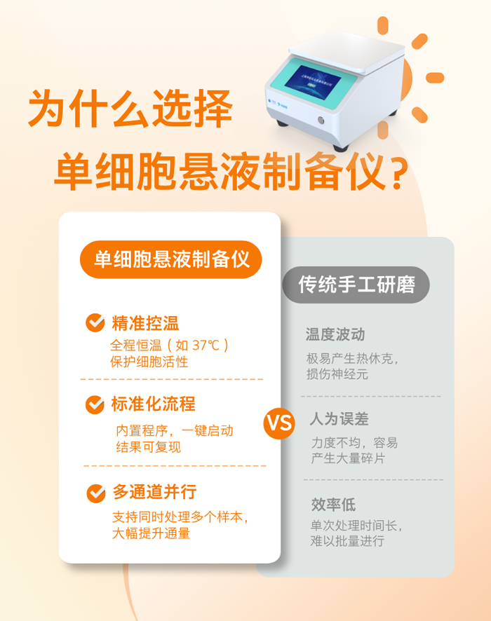 背景介紹:在神經科學研究中,小鼠腦組織的解離一直是一道“硬骨頭”。傳統的手工研磨不僅耗時費力,更常因機械剪切力過大或溫度控制不均,導致細胞受損、活率低下。今天,我們分享一款儀器——單細胞懸液制備儀,讓您的實驗數據大大提升。